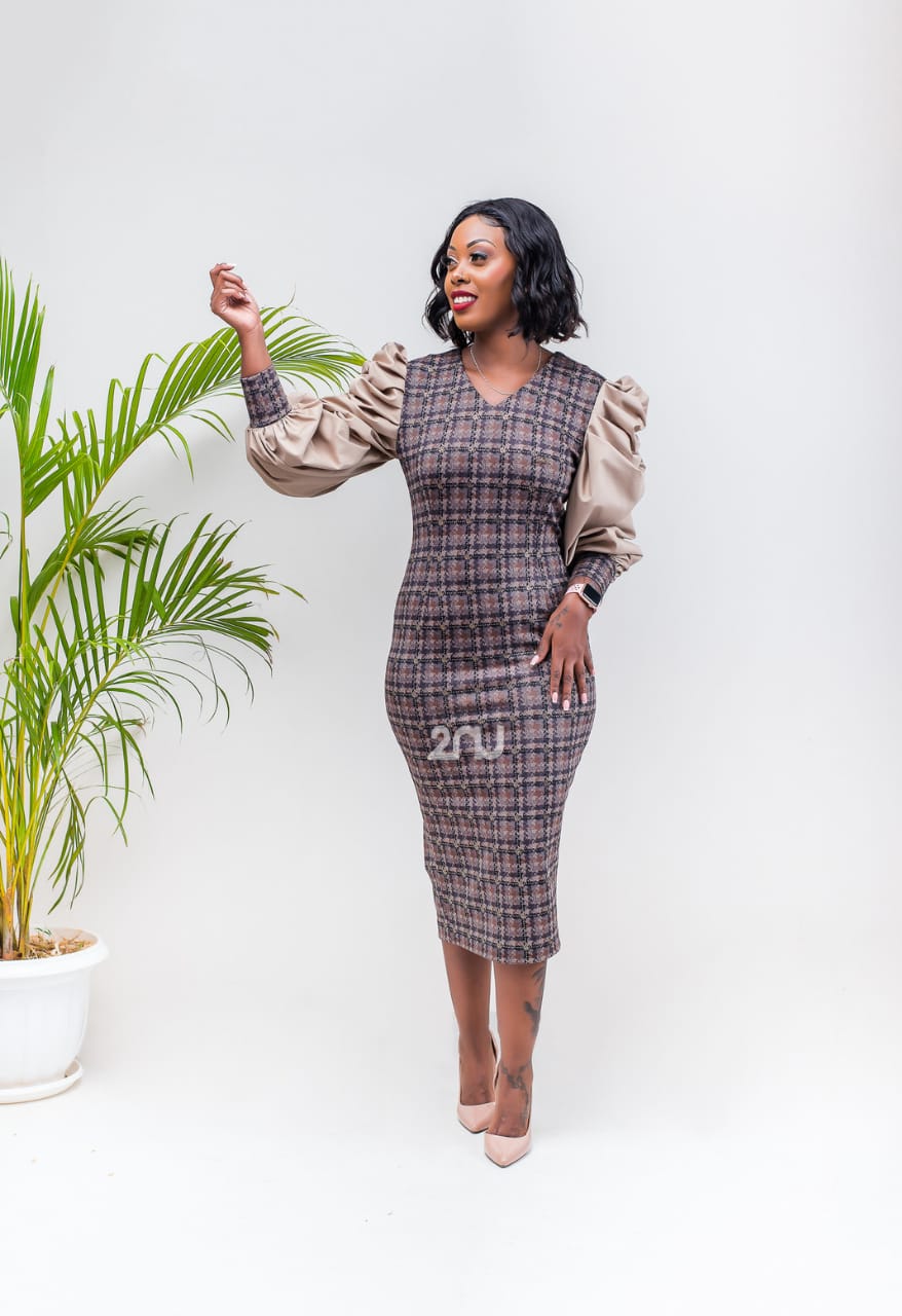 Be the first to review “Chocolate Checked Bubble Sleeves Stretch dress”